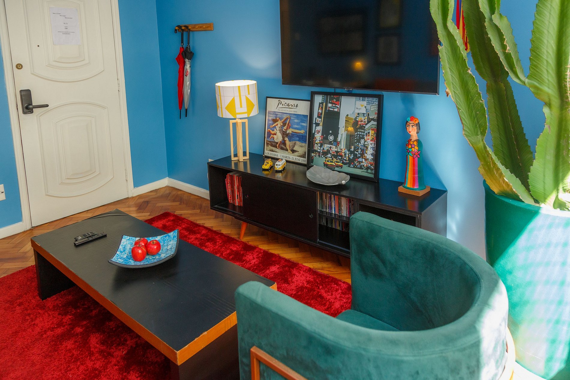 Never been in an apartment so well equiped: there are chairs for the beach, a laundry machine that also dries, everything needed in the kitchen, AC in every room, TV and more! It's also very well decorated with art and plants, very luminous and very spacious