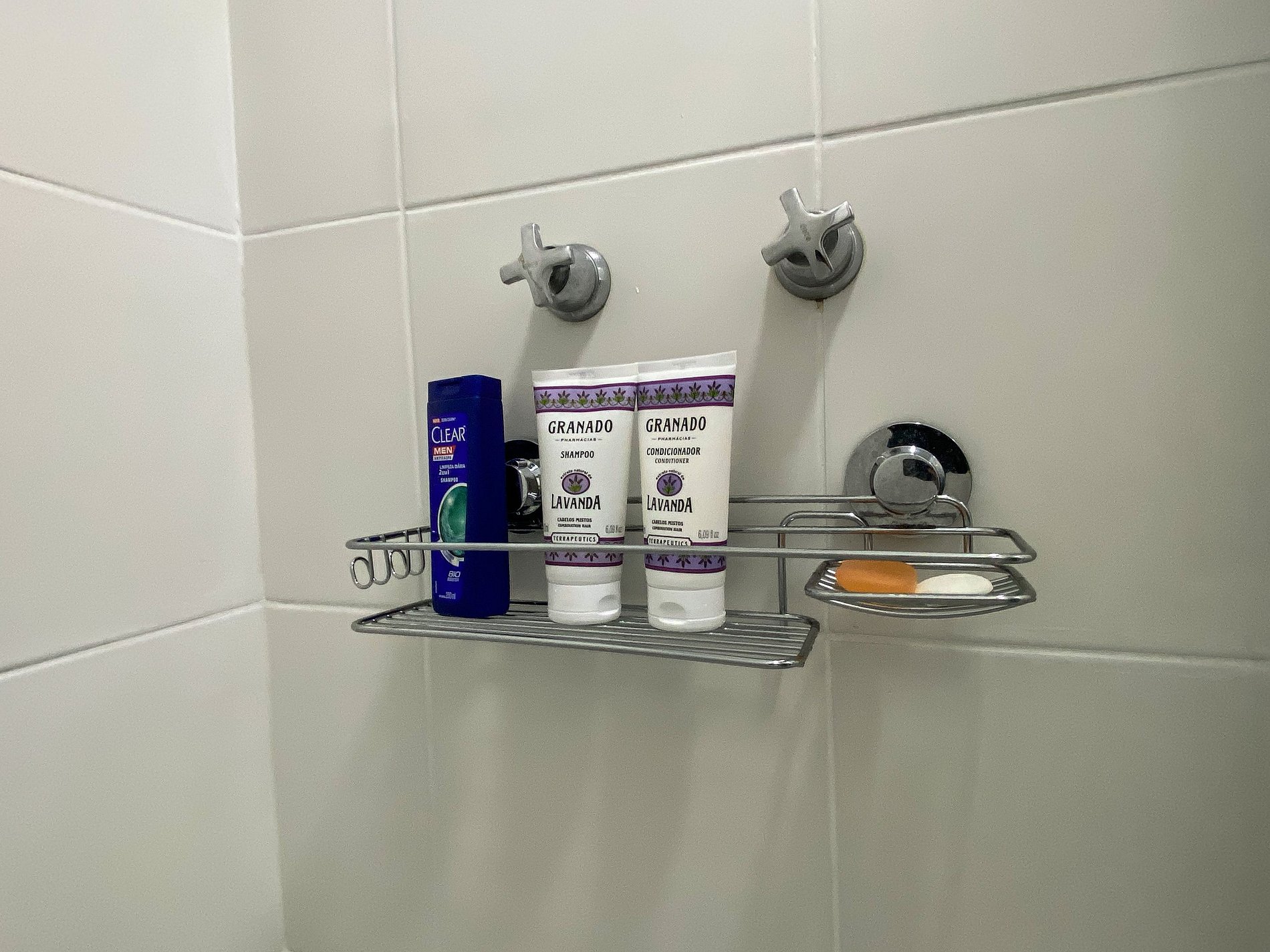 Banheiro sem local pra colocar itens de higiene pessoal. Vazamento no chuveiro e falta pano de prato na cozinha.